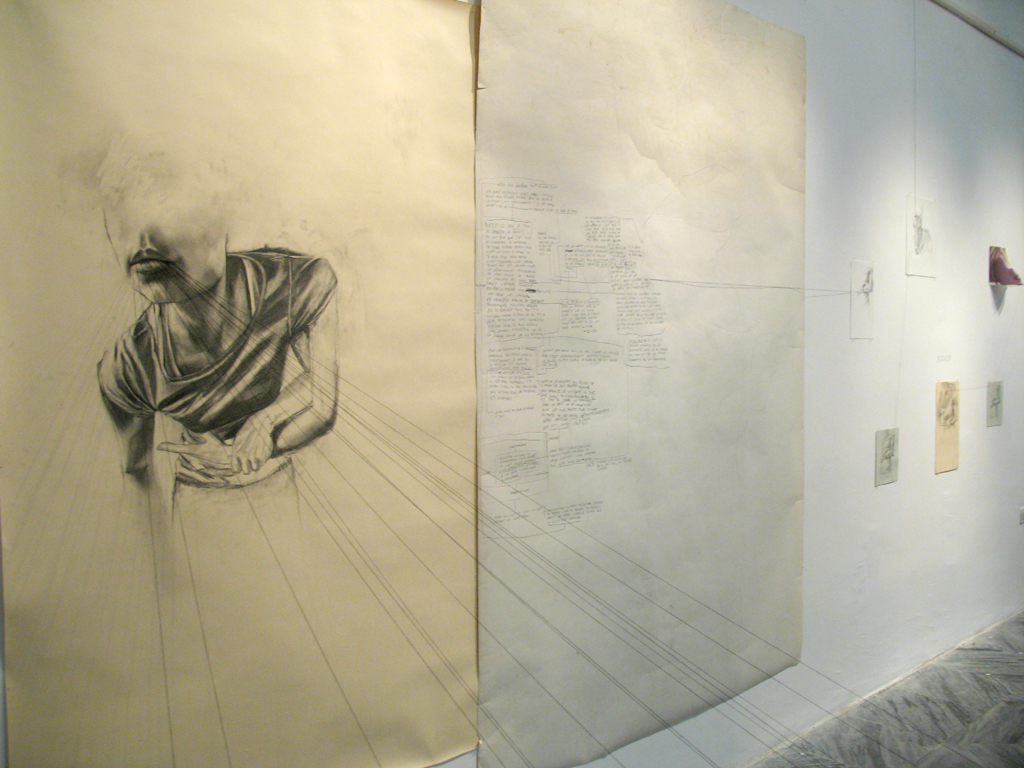 Déboîter la pensée, la servir aux yeux, sous une forme schématisée et graphique. Un grand dessin au mur présente un corps penché vers l’avant, laissant sortir de la bouche représentée, une multitude fils, qui rejoignent des petites boîtes de carton, coulées de plâtre. Projet présenté à La Havane, Arte de Quebec en La Habana au Centro de Desarrollo de las Artes Visuales (2008).