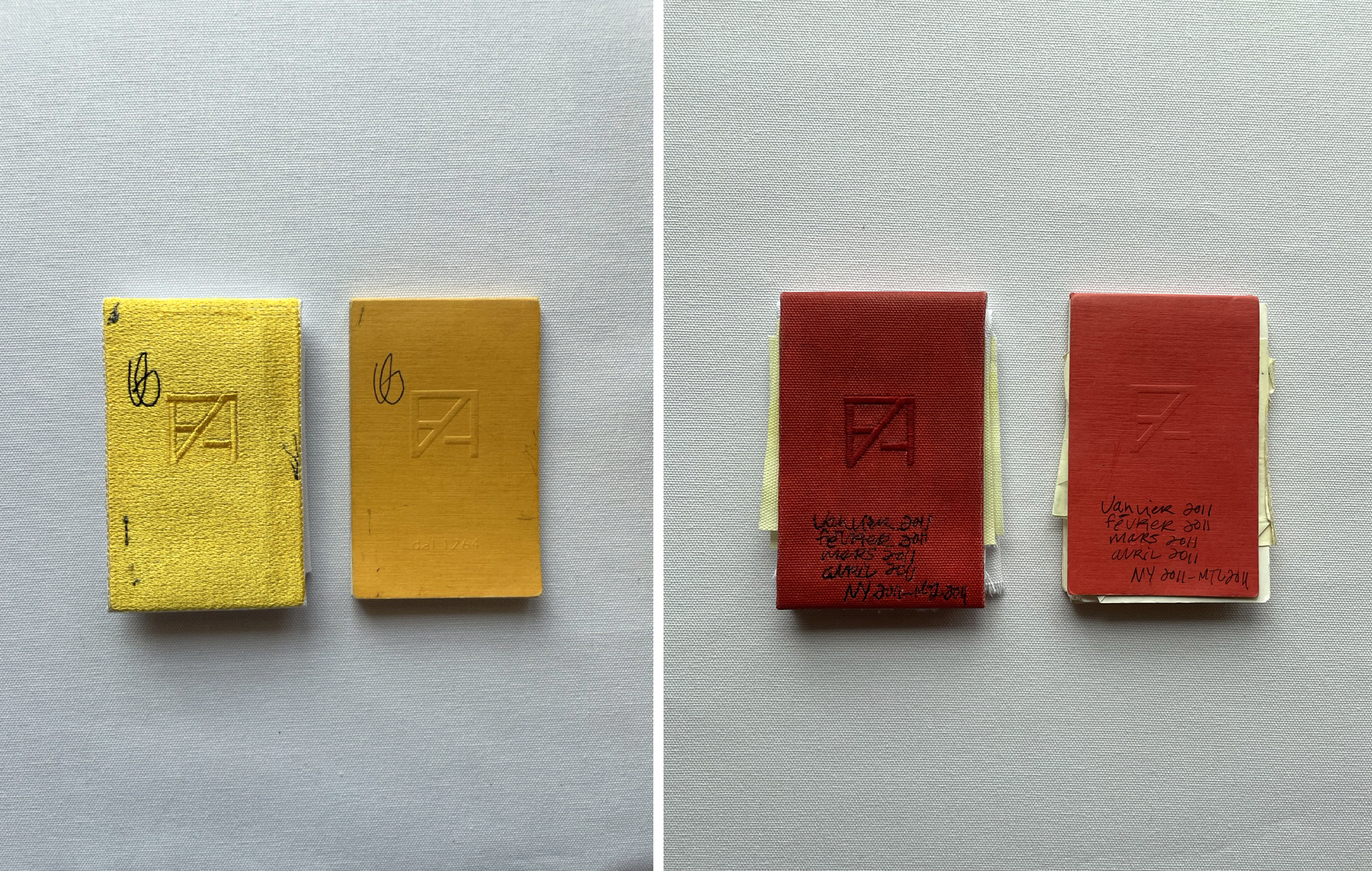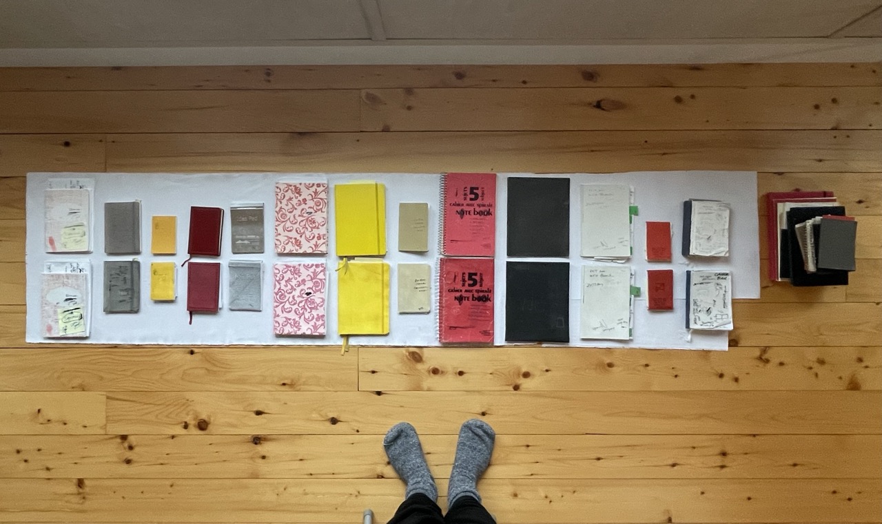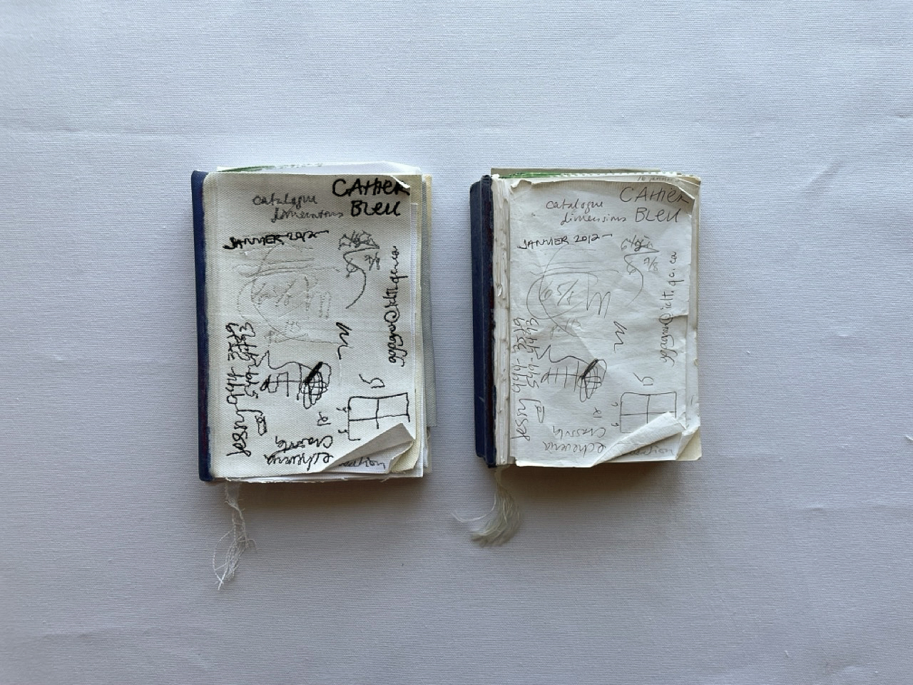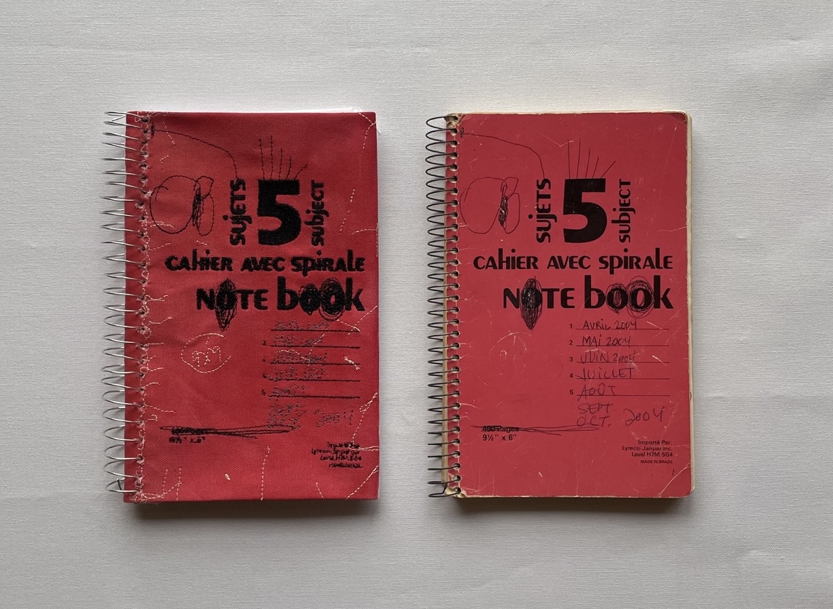 Depuis le début de ma pratique artistique, je tiens quotidiennement un carnet de notes et de dessins pour accompagner les processus de production en atelier. En 2023, j'avais accumulé une quarantaine de carnets, que j'ai commencé à refaire le plus fidèlement possible en aquarelle et broderie, en respectant les dimensions, les formes et les couleurs. Lors de la résidence à Annandale, j'ai produis 14 carnets, qui, lorsque placées en parallèle avec les carnets originaux, retrouve toute leur force sculpturale.