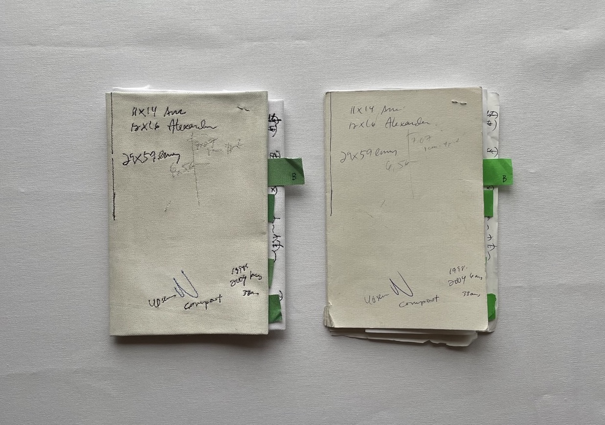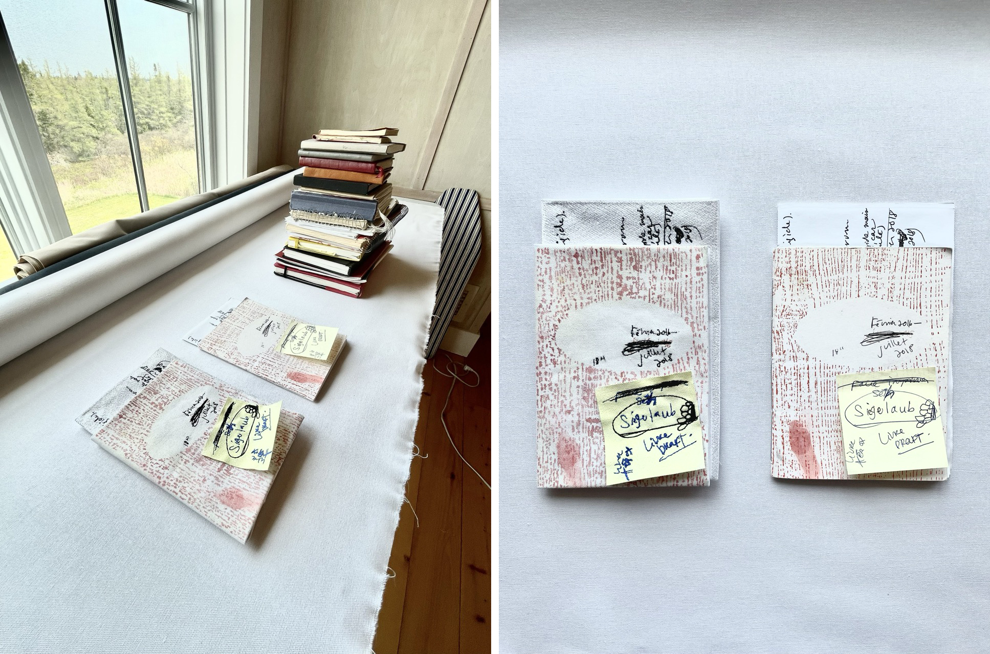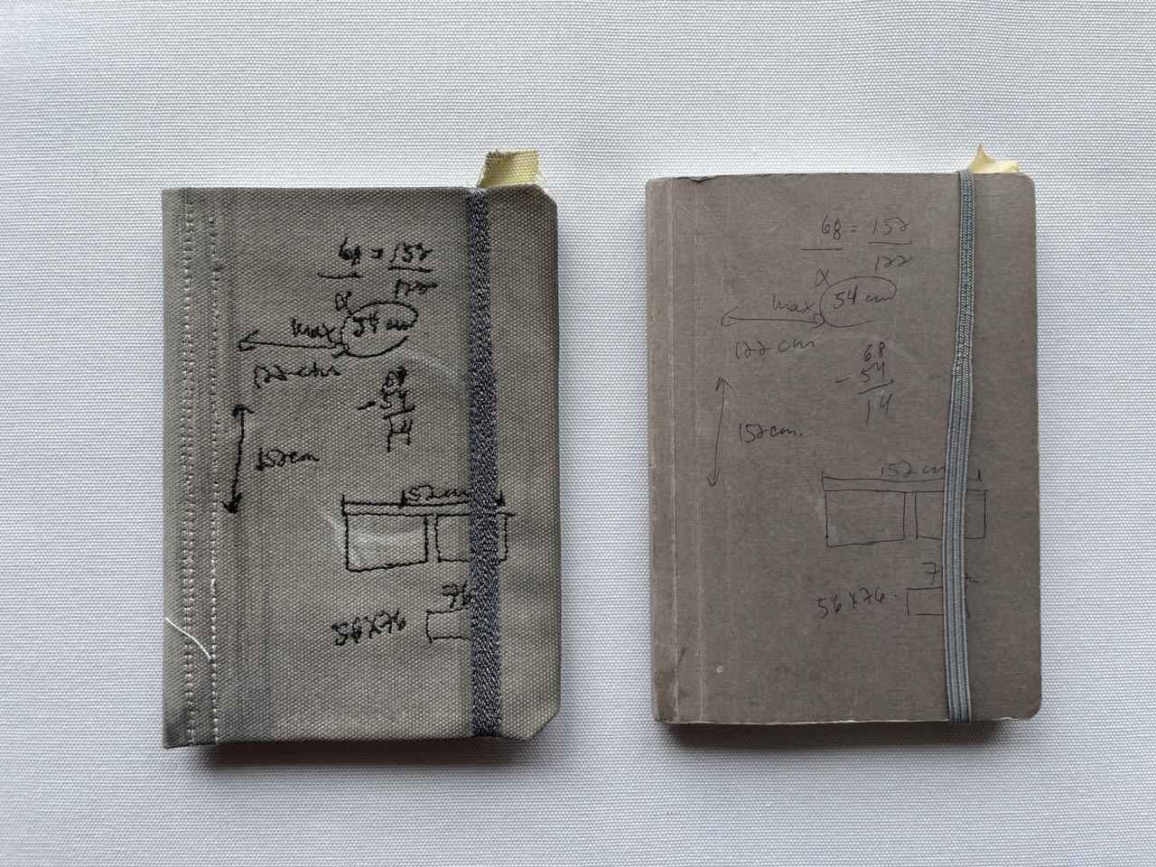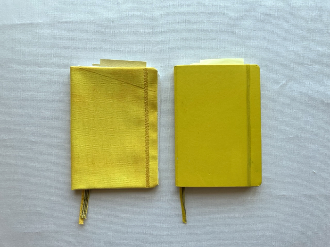 Depuis le début de ma pratique artistique, je tiens quotidiennement un carnet de notes et de dessins pour accompagner les processus de production en atelier. En 2023, j'avais accumulé une quarantaine de carnets, que j'ai commencé à refaire le plus fidèlement possible en aquarelle et broderie, en respectant les dimensions, les formes et les couleurs. Lors de la résidence à Annandale, j'ai produis 14 carnets, qui, lorsque placées en parallèle avec les carnets originaux, retrouve toute leur force sculpturale.